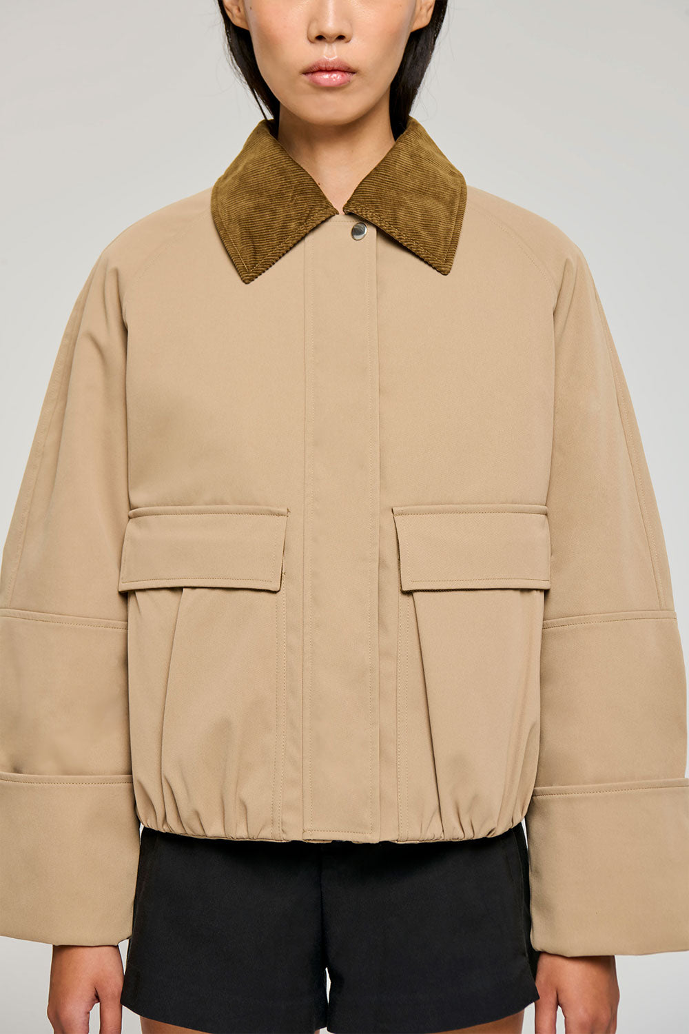 Short jacket characterized by a corduroy collar and front pockets. The zipper closure is discreet, with a snap button on the collar, while the ruching on the sides and the sleeve detail add character and movement to the garment. The over fit model is designed for urban life, offering comfort and freedom of movement; the functional and stylistic details complete the garment.