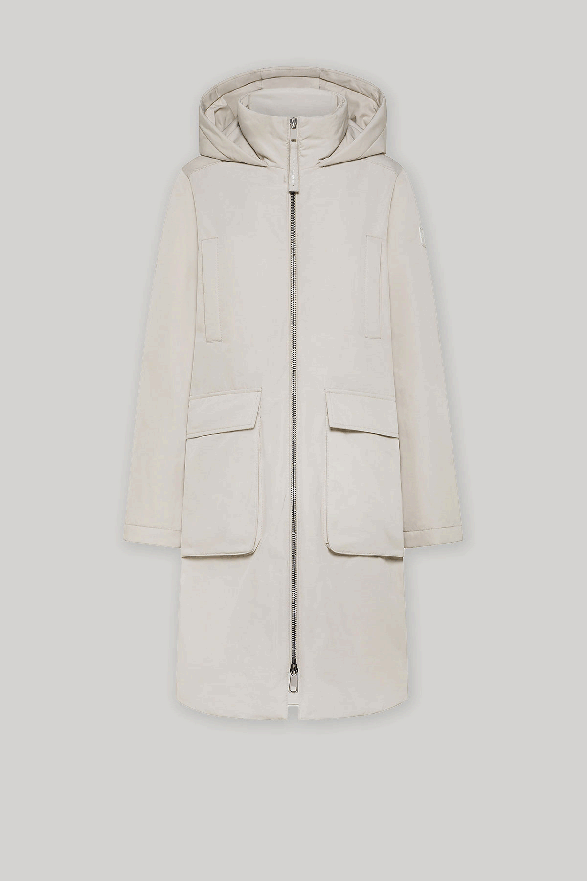 Long jacket with hood, characterized by a regular fit and an essential design. Made of water-repellent memory nylon, a technical fabric that guarantees resistance and protection from the elements, while maintaining a soft hand and a clean line. The patch pockets applied on the front add functionality, while the central zip closure ensures everyday practicality.
