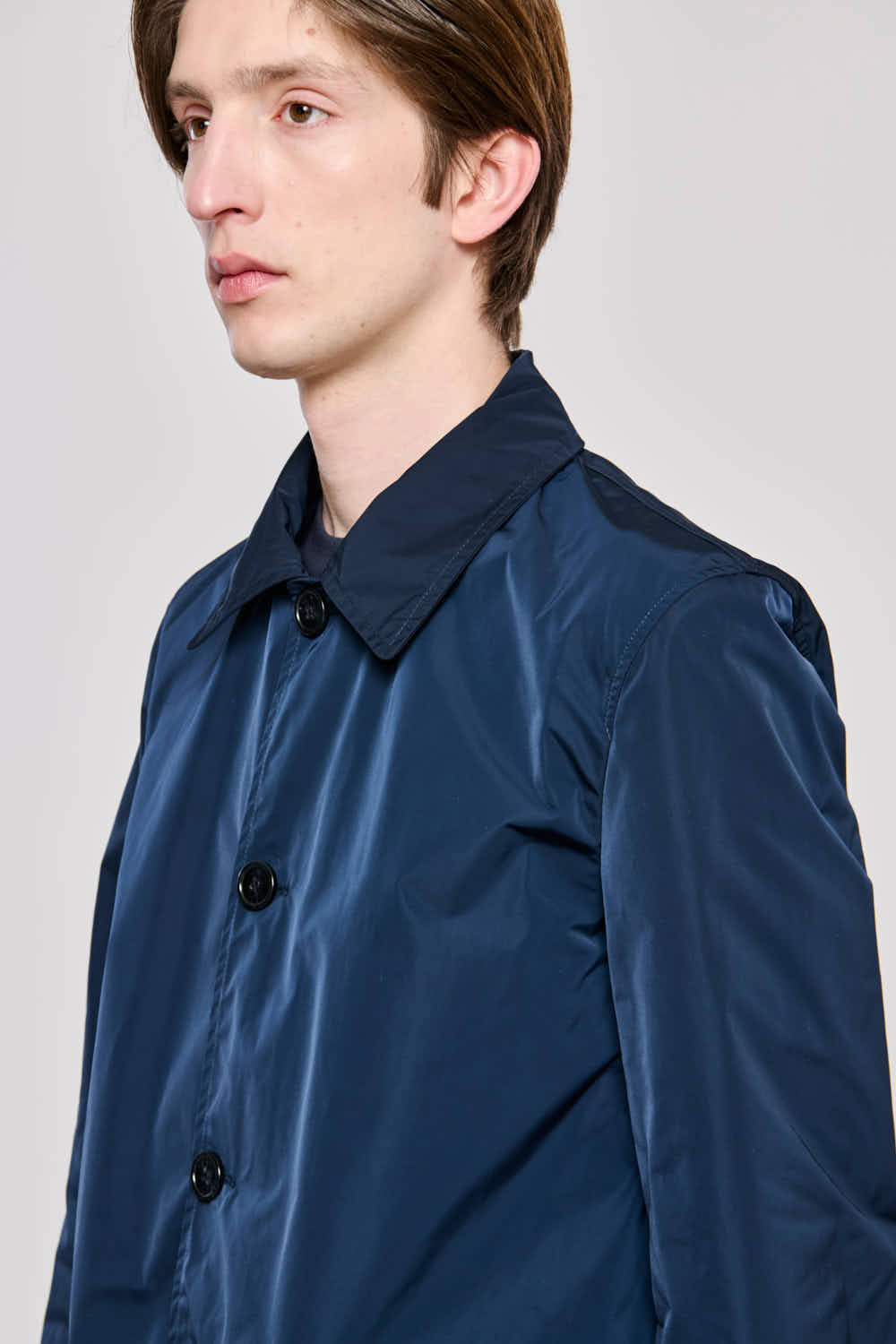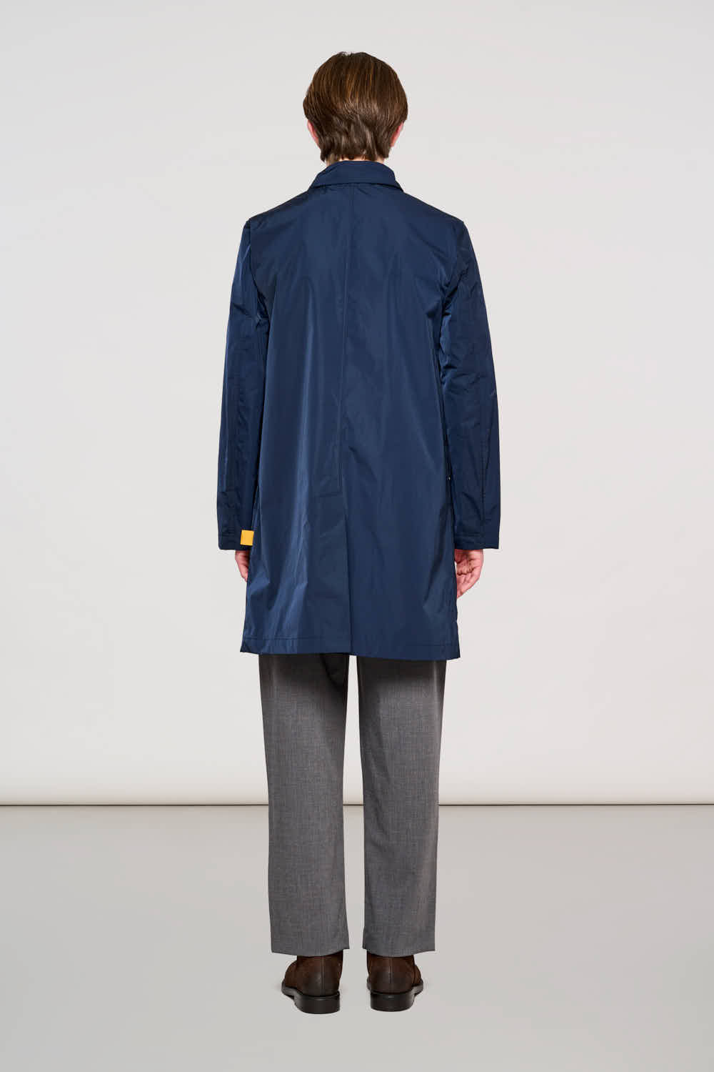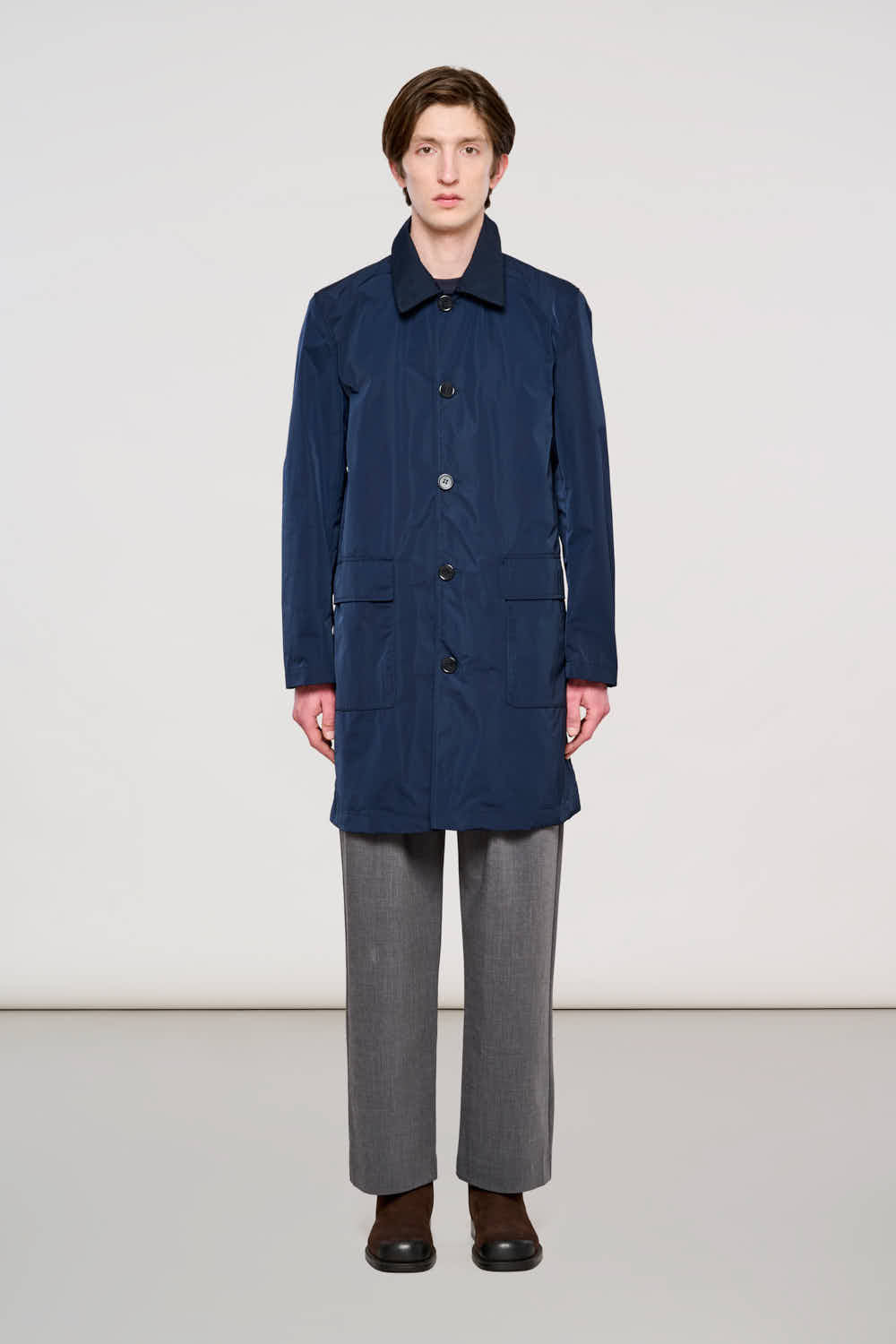Il 0400 Brera Carcoat è l'espressione definitiva dell'eleganza metropolitana funzionale. Realizzato in pregiato tessuto Memory nella classica tonalità Total Eclipse, questo soprabito unisce una silhouette monopetto rigorosa alla praticità di un materiale che resiste alle pieghe e mantiene la forma tutto il giorno. Le linee pulite, arricchite da un collo classico strutturato e ampie tasche a toppa con patta, lo rendono perfetto da indossare sopra un abito formale o per elevare un outfit casual. Un capo essenziale che bilancia tradizione sartoriale e innovazione tecnica.